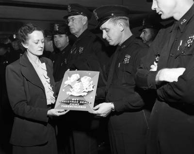 Mrs. Irene McCall of the Fort Worth-Tarrant County Tuberculosis Society, gives Patrolman H. D. Edmondson one of the 500 posters which were distributed to business firms by policemen on the afternoon shift. Sam J. Knight, center, and L. N. Price, in background, looks on. Published in the Fort Worth Star-Telegram morning edition November 21, 1950.