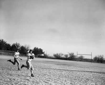 Image of Vance Bridges, Arlington Heights' halfback, gathers in a pass from Buzz Kemble for a long gain against Tech in a B game. The other player is unidentified. The Jackets won, 39-0, for their 10th straight victory.