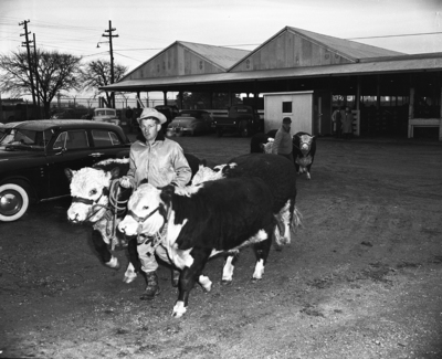 Image shows cattle that had arrived by special train from Senatobia. La Verne Barnes of the Double E Ranchar Senatobia is leading the first group. Donald Chambliss of Wall, Mississippi, leads the second group.