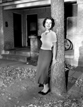 Pictured here is Beverly Hendricks, North Side queen. She is shown leaning her back to a tree. Published in the Fort Worth Star-Telegram morning edition, November 22, 1950.