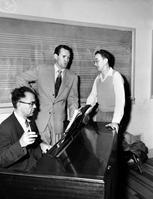 Karl Kritz, Fort Worth Opera director, gives the musical accompaniment as Norris Greer, center, and Floyd Lisle, right, rehearse their roles for "The Bat." Published in the Fort Worth Star-Telegram evening edition, November 23, 1950.