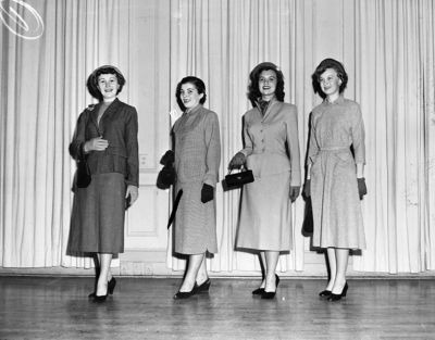 The first girl from left to right, won a grand prize in the statewide finals of the "Make It Yourself With Wool and Mohair" contest at Hotel Texas. Her name is Barbara Hendricks of Roscoe, junior division winner. Published in the Fort Worth Star-Telegram morning edition, November 22, 1950.