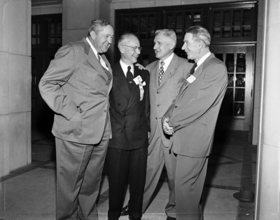 First North Side Gridmen, Coach, at Homecoming. Left to right are John Condon, Chief Myers, Madison Bell and Jack Marsh. Published in the Fort Worth Star-Telegram morning edition November 23, 1950.