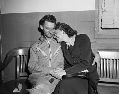 Her joy at his safe return from the B-36 crash near Crowley literally radiated from Mrs. Oliver F. Hildebrandt of 6032 Curzon when she cuddled up to the first lieutenant in a Carswell Air Base briefing room after he had reported, as plane commander, details of the tragedy which took two officers' lives. Published in the Fort Worth Star-Telegram evening edition November 23, 1950.