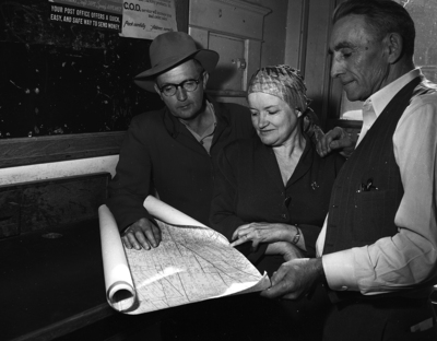 R. M. Lowe, 6008 Karen Circle, Fort Worth, geologist for F. Kirk Johnson, Fort Worth, shows location for the latter's No. 1 Lee Smith, section 1, block 143, H&TC survey, to Mr. and Mrs. M. N. Guest of Aspermont, postmaster there since 1934. A test is being drilled on the Guest land by the De Soto Oil Company. Published in the Fort Worth Star-Telegram morning edition November 26, 1950.