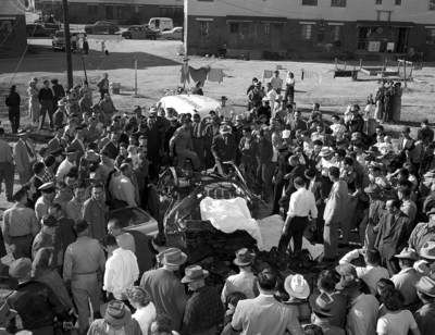 Some of the estimated 1,00 persons who flocked to the Nelson Harris explosion scene. Published in the Fort Worth Star-Telegram evening edition November 22, 1950.