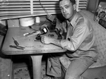 Member of the drilling crew is Richard Parker, Wichita Falls, Phillips Petroleum, Company geologist watching the outpost. Published in the Fort Worth Star-Telegram morning edition December 3, 1950.