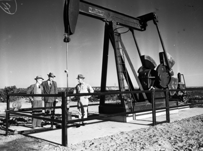 In photo is the Norsworthy No. 1 C. D. Wiley, conglomerate discovery in the county. Left to right, John H. Dorlon, Midland, who assembled the block; L. R. Myers, Aspermont real estate operator, and Jack Robbins, pumper. Published in the Fort Worth Star-Telegram morning edition December 3, 1950.