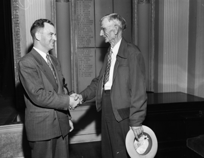 District Judge Thomas J. Renfro, left, shaking hands with Tom G. Sellars.