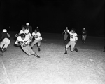 Harland Tidwell, North Side back, heads for the goal line with a blocker, George Beal (53) leading the way after taking a flat pass in the first quarter against Paschal night at Farrington Field. The Steer on the right is Tommy Runnells (60). The play covered five yards. Published in Fort Worth Star-Telegram morning edition November 24, 1950.