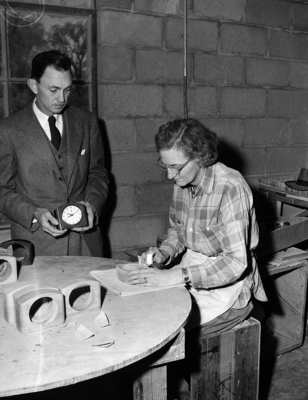 Scene from the daily operations of a wood making shop in Fort Worth where wood cases are made for alarm clocks for a nationally-known manufacturer. John Wesley Jones, owner of the shop, holding the finished product in his hand as he watches Mrs. Elois Jones apply the fine finish by hand-sanding. Published in the Fort Worth Star-Telegram morning edition November 26, 1950.