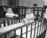 Rita Ann Whitworth, 16 months, shows her banaged burn to Linda fern Waldrop,2. Linda's glum because she can't show her burn- it's on her back. Both children are patients at the City-County Hospital pediatrics ward. Published in the Fort Worth Star-Telegram morning edition November 28, 1950.