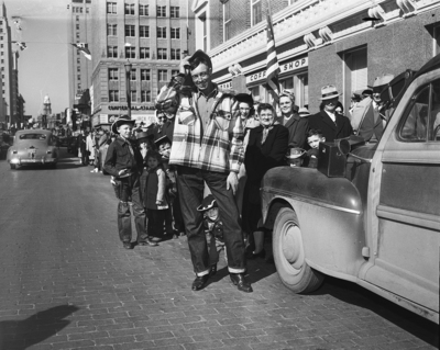 Image shows Collin Kilborn George, 2, of Eastland hiding between the legs of Ollie Johnson of Hot Springs, New Mexico as they watch the parade opening the Southwestern Exposition and Fat Stock Show.