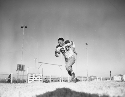 Posed action image of guard Ronald Dunagan. He will get a starting call in Olney's Class A quarterfinals tilt against Arlington. He is an all-district selection. Published in Fort Worth Star-Telegram morning edition November 28, 1950.