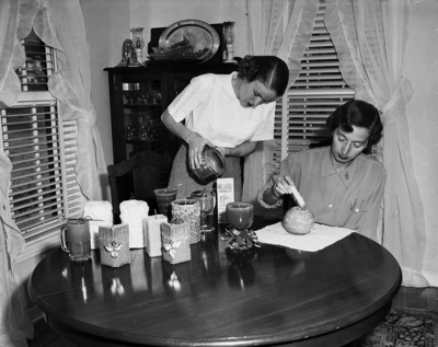 Mmes. T. U. Taylor, left, and John J. Velten practice making Christmas candles in odd shapes and bright colors to add a personal touch to holiday tables. Published in Fort Worth Star-Telegram morning edition December 17, 1950.