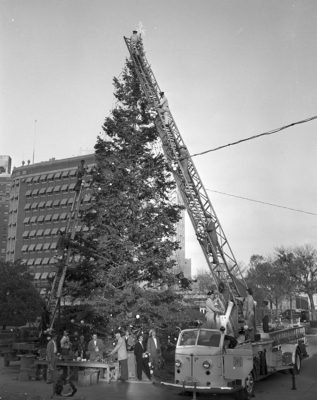 In ceremonies this 60-foot fir- the Star-Telegram 1950 commuity Christmas Tree- will be officially lighted in Burk Burnett Park. Decorators, headed by Jimmie Cook and aided by city firemen and recreation department workers, are shown stringing ornaments on the tree. Published in the Fort Worth Star-Telegram evening edition November 30, 1950.