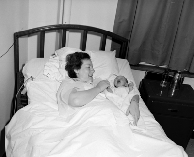 Birthplace of Julianne Bush was St. Joseph's Hospital, but it barely missed being the auto of her parents, Mr. and Mrs. Nat H. Bush of Jacksboro. The father raced behind an ambulance, which was on another call, through traffic to the hospital, beating the stork by seven minutes. Julianne is shown greeting her mother with a lusty yell. Published in the Fort Worth Star-Telegram evening edition November 27, 1950.