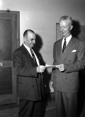 City Tax Assessor-Collector Curlee, at left, receives a first tax payment totaling $283,318.54 from O. G. Carlson, right, district manage of Texas Electric Service Company, the city's largest taxpayer. Published in the Fort Worth Star-Telegram evening edition November 27, 1950.