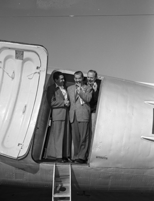 Comedian Jerry Colonna at Carswell with Ay Averback, left, and Al Capstaff, right, of NBC. Published in the Fort Worth Star-Telegram evening edition November 27, 1950.