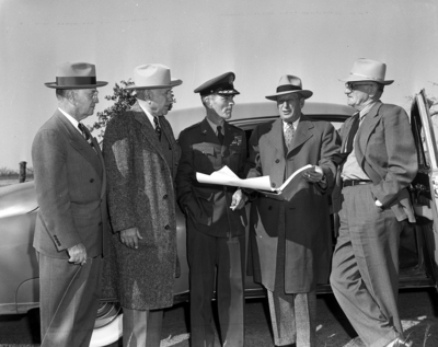 Members of the Air Force Academy Board standing outside. Among them is: Amon Carter, second from left, and Lieutenant General Hubert Reilly, third from left.