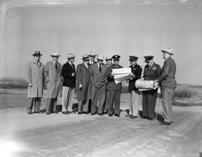 Members of the Air Force Academy Board standing outside. Standing from left to right: William Holden, O. L. Fowle, Bill Yancey, Ben Critz, Dale Miller, General Carl Spaatz, Amon Carter, Lieutant General H. A. Harmon, Lieutant Colonel William P. Jones, Brigadier General Harold C. Clark, and Doctor Bruce Hopper.