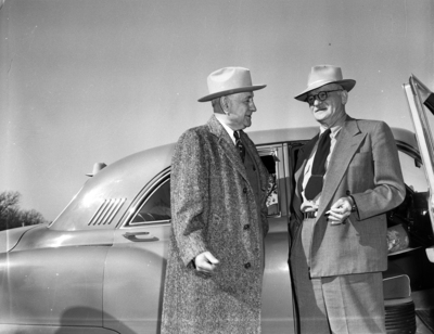 Amon Carter, left, smiling at General Carl Spaatz, while they stand in front of a car.