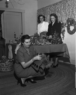 Putting finishing touches on whimsical centerpieces for Christmas tables are members of the committee for the First Christian Church bazar which will be held. Mrs. Lambuth Tomlinson, kneeling, is chairman of the committee. Members are, left to right, Mmes. Clyde Morrison and J. Nolan Murphy. Published in the Fort Worth Star-Telegram evening edition December 1, 1950.