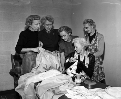 Members of All Saints Episcopal Church at Crestline Road and Pentecost have spent months in preparation for the church's bazar to be held to raise funds to furnish the new educational building now under construction. Putting the last minute touches on aprons which will make up one booth are, left to right, Mrs. Jack Corn of 4601 Crestline Road, Mrs. H. E. Aldrich of 4700 Lafayette, Mrs. Fred H. Bush of 1817 Hill Crest, Mrs. William Halpin of 5100 Byers and Mrs. Gladys Davies of 4936 Dexter. Published in the Fort Worth Star-Telegram evening edition November 29, 1950.