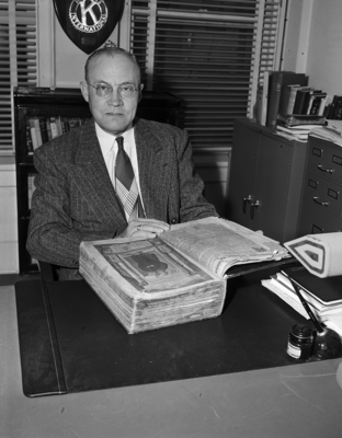 Reverend F. Bohmfalk, pastor of Central Methodist Church, is shown with his family Bible, a Martin Luther translation, which was printed in Germany in 1641. Published in the Fort Worth Star-Telegram evening edition December 2, 1950.