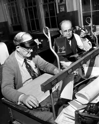 Wire Chief Paul H. Fillmore Sr., left, and Everest B. Rosser, first trick operator, with a total of nearly 100 years' telegraphing between them, are still busy in the T&P Terminal here at a profession they were told was 'dying' for two generations. Published in Fort Worth Star-Telegram evening edition, December 4, 1950.