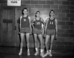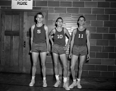 Image shows Amon Carter Riverside basketball players from left to right, Fred Whithers (5), Dennis Buchanan (10) and Phil Whithers (11) posed.