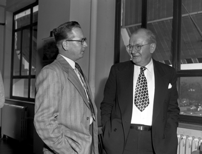 Earl E. Frost, right, Bridgeport postmaster, who was arraigned on charges of falsifying postoffice records to conceal a $500 shortage, is shown chatting with Rex H. Bird, Bridgeport businessman who put a $500 cash bond for his release. Published in the Fort Worth Star-Telegram morning edition November 30, 1950.
