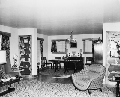 The picture shows how built-in shelves can be both decorative and functional in combination living-dining room as seen in the new Crestwood home of Mr. and Mrs.. ted Gorski, 108 Lindenwood Dr. Published in Fort Worth Star-Telegram morning edition December 10, 1950.