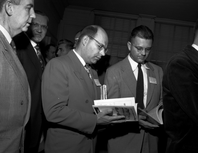 Snapped studying the program of the regional exploration meeting of geologists and geophysicists at Hotel Texas were Lyle Harvey, left, and Aubrey Rabensburg, both with John W. Mecom, Houston. Published in the Fort Worth Star-Telegram evening edition December 1, 1950.
