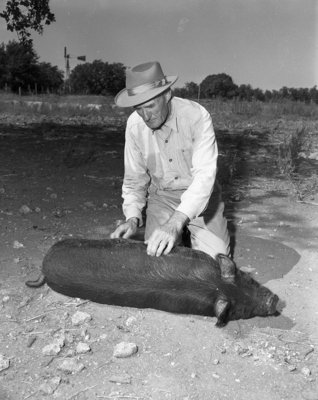 Milton Stanley scratches Pollyanna, his guinea hog that trots after him with a dog-like devotion. She's the hog breeder's favorite pet. Published in the Fort Worth Star-Telegram morning edition November 29, 1950.