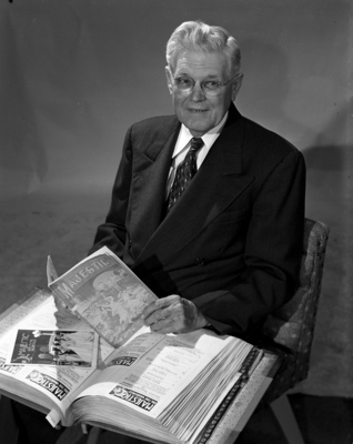 Julian Umbenhour shown looking at scrapebook. Published in the Fort Worth Star-Telegram evening edition November 29, 1950.