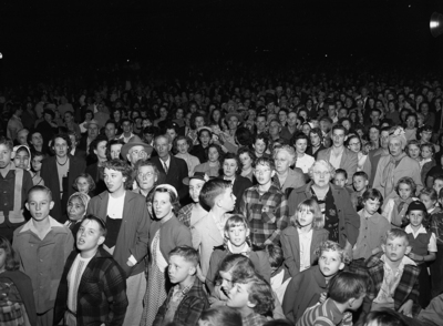 The Star-Telegram community Christmas tree, with its myriad lights and scintillating decorations is proving an attraction to both young and old, as this picture shows. This was part of the crowd that saw the tree lighted. Published in the Fort Worth Star-Telegram morning edition December 3, 1950.