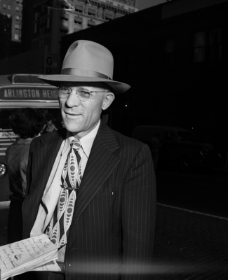 Portrait of O. R. Pickard in the street, dressed in a cowboy hat, suit and tie combo.