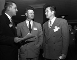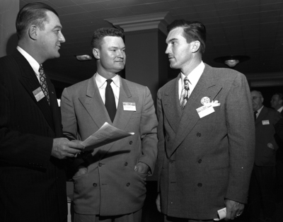 This pre-luncheon huddle at Hotel Texas found three home builders talking over their problems. Left to right, William J. Tobin of Washington, staff member of the National Association of Home Builders; Troy Jones of Amarillo, retiring Texas president, and Jack C. Llewellyn, president of the Fort Worth association who presided at the luncheon. Published in the Fort Worth Star-Telegram morning edition December 2, 1950.