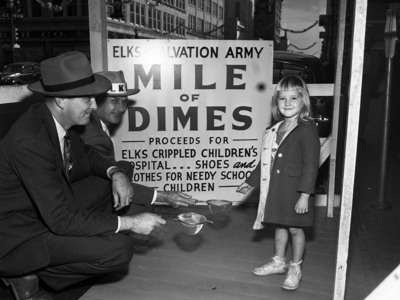 Four-year-old Diane Spivey daughter of Mr. and Mrs. Milam Spivey of 3012 Golden-rod, gave her contribution to the Elks Club-Salvation Army Mile of Dimes to help crippled and under-priviledged children. With her are C. C. Barnhart, left, Elks exalted ruler, and A. M. Reese, esteemed leading knight and chairman of the Mile of Dimes campaign. Published in the Fort Worth Star-Telegram morning edition December 2, 1950.