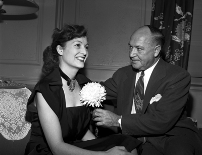 Edgar T. Wolfe, Columbus, Ohio, newspaper publisher, and Mrs. Wolfe, spotted with a big mum on her jacket lapel, are ready to see the Texas Christian University versus Southern Methodist University game in Dallas- "mum" and all. Published in the Fort Worth Star-Telegram morning edition December 2, 1950.