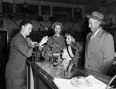 They Roy Davis family of Odessa, in Fort Worth for an annual Christmas shopping expedition, is shown some recording equipment in a camera store by G. W. Moore. Published in the Fort Worth Star-Telegram morning edition December 4, 1950.