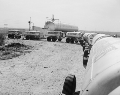 Image of Anhydrous ammonia tanks mounted on trailers are lined up for refilling at a dealer's storage tank near Hereford, Texas. Shown in the Ranch and Farm section of the Fort Worth Star-Telegram. Published in Fort Worth Star-Telegram morning edition December 3, 1950.