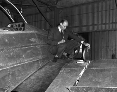 Image of Fred Weick, designer, looks over the spray tank lid on the new agricultural plane being built at Texas A&M. The spray tanks in both wings will hold 150 gallons, will have acid-resistant liners.