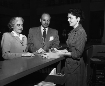 Among the firsts to buy tickets for the Southwestern Exposition and Fat Stock Show rodeo when the sale opened at the Central Ticket Office at Hotel Texas were, left to right, Mrs. Ann Owens and Jay Williams. Selling the tickets is Mrs. Charles Adams, right.