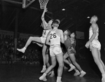 Image shows Texas Christian University (TCU) versus Hardin- Simmons basketball game. TCU forward Harvey Fromme (24) closes eyes as scoring effort fails against Hardin Simmons. TCU Ted Reynolds (26) watches as Hardin Simmons players Jay Cox (24) and Pete Golson (22) move in for ball. One unidentified player on right.