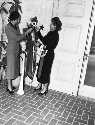 Tying a door decoration Mmes. A. E. brooks, left, and G. Herbert Beavers Jr. work out a "greens" display for the Fort Worth Garden Club Christmas bazar to be held December 15. Published in Fort Worth Star-Telegram morning edition December 9, 1950.