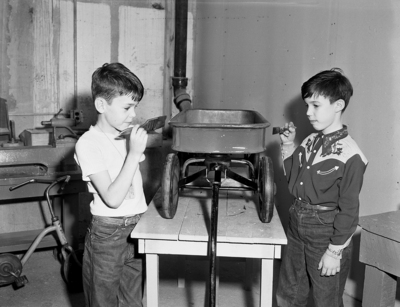 Bobby Joe Dunlap, son of Mr. and Mrs. J. A. Dunlap of 1316 College, and Jackie Tidwell, son of Mr. and Mrs. Jack Tidwell of 1425 Alston, are spending a lot time at the Panther Boys Club these days getting toys repaired and painted for distribution to needy children at Christmas. The boys of the club are asking that all broken or discarded toys be brought to their headquarters at 1515 Lipscomb. Published in the Fort Worth Star-Telegram morning edition December 7, 1950.