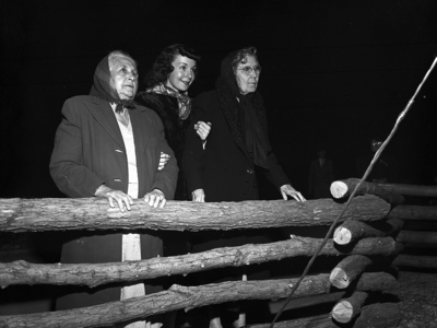 Mrs. Olga Drew, left, sprightly 85-year-old, sang German Christmas carols as she and some of her friends from Elia's Rest Home, 2740 Avenue Kansas, got their first look at the Star-Telegram's Community Christmas tree. With her are Miss Johnnie Elia, nurse who accompanied the ladies, and Mrs. Della Ann Ennis, 78. Published in the Fort Worth Star-Telegram morning edition December 5, 1950.