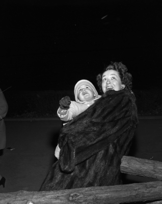 Flurries of snow did not keep 3-year-old Pamela Ruth Forster of Buffalo, New York, from seeing the Star-Telegram community Christmas tree. Holding her little niece and namesake is Miss Ruth House wright of Fort Worth. Published in the Fort Worth Star-Telegram morning edition December 6, 1950.